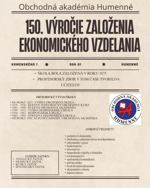 Rok 2025 je pre našu školu výnimočný – Obchodná akadémia v Humennom si pripomína 150. výročie svojho založenia. Inštitúcia, ktorá vychovala tisícky odborníkov, si v novembri pripomenie, že už dlhé roky, počas ktorých si prešla mnohými zmenami, vychováva zodpovedných úradníkov, ekonómov či podnikateľov.