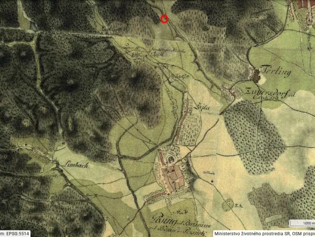 Starý Pezinok s cca 4000 obyvateľmi a miesto kde v tej dobe začne rásť náš dub. Mapovanie 1764–1787.
