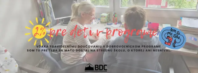 Poukázaním Vašich 2% z dane (alebo 3%, ak ste odpracovali aspoň 40 hodín dobrovoľníctva) na program Som tu pre Teba podporíte doučovanie a podporu detí v príprave na školské povinnosti, zvyšovanie ich motivácie, zlepšovanie výsledky nielen v škole, no najmä pomôžete s ich sociálnym začlenením.