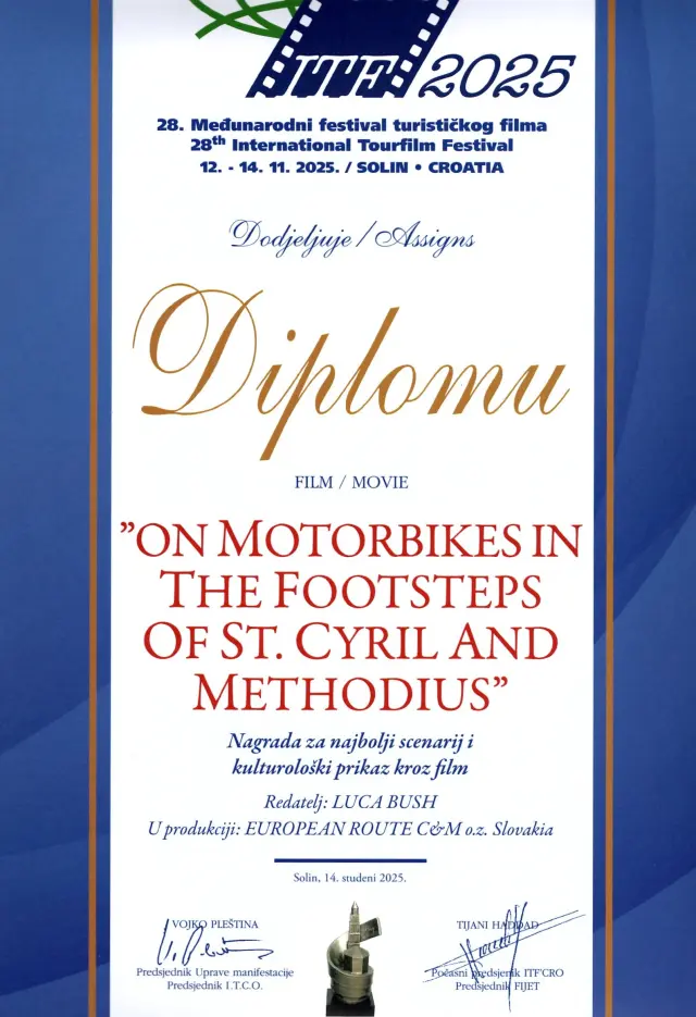 Zároveň sa chceme s Vami podeliť o informáciu, že prvý diel nášho filmu bol minulý týždeň v Chorvátskom meste Solin ocenený na prestížnom Medzinárodnom festivale turistického filmu ITF’CRO 2025. Porota udelila filmu Cenu za najlepší scenár a kulturologické spracovanie, čím ocenila originálny prístup tvorcov, ktorí prepojili pútnickú trasu cez Európu, s kultúrnym dedičstvom sv. Cyrila a Metoda do podoby moderného cestopisu s humorno-zážitkovým štýlom. Medzinárodná konkurencia bola mimoriadne silná: • 423 filmov z 135 krajín sveta • 142 nominovaných filmov • 34 ocenených titulov.