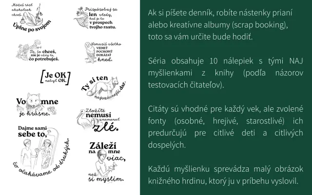 1️⃣ nálepky s citátmi z knihy – budú sa krásne vynímať, kdekoľvek ich nalepíte. A pripomínať to dôležité…
