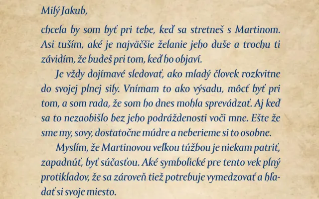 Pre mladších …násťročných, ktorí radi čítajú (a ku ktorým už zavítala puberta). Zažívajú prvé emočné zmätky a sú dosť vnímaví na to, aby si to uvedomili. Slovo „pocit“ pre nich nie je na zakázanej listine. Znesú ešte rozprávkovosť, ak nie je infantilná – túto knihu by sme mohli nazvať rozprávkou pre veľkých. Vedia byť sami so sebou a premýšľať, vedia počúvať. Sú ešte hraví, chcú sa pýtať aj dostávať odpovede. Do dospelosti sa neponáhľajú. Dôležité je ale dodať, že odporúčam, aby ste si knihu najprv prečítali vy. Vy budete tou cestou od myšlienok v knihe k vašim deťom. Najväčšie želanie duše je však aj pre vás, milí dospelí. Pre vašich „vnútorných tínedžerov“ – tých, ktorými ste niekedy boli. Stále viac sa hovorí o tom, ako sa treba postarať o svoje vnútorné dieťa. No vnímam, že rovnako dôležité je postarať sa o svojho vnútorného tínedžera – dať hlas pocitom, ktoré boli vtedy také dôležité, aby ste vedeli počuť, čo vám dnes hovoria vaše deti. Kniha je teda aj pre rodičov, učiteľov a sprievodcov, ktorí občas hľadajú tie správne vety a ktorí sa chcú rozpomenúť, čo bolo dôležité pre nich v tomto období.