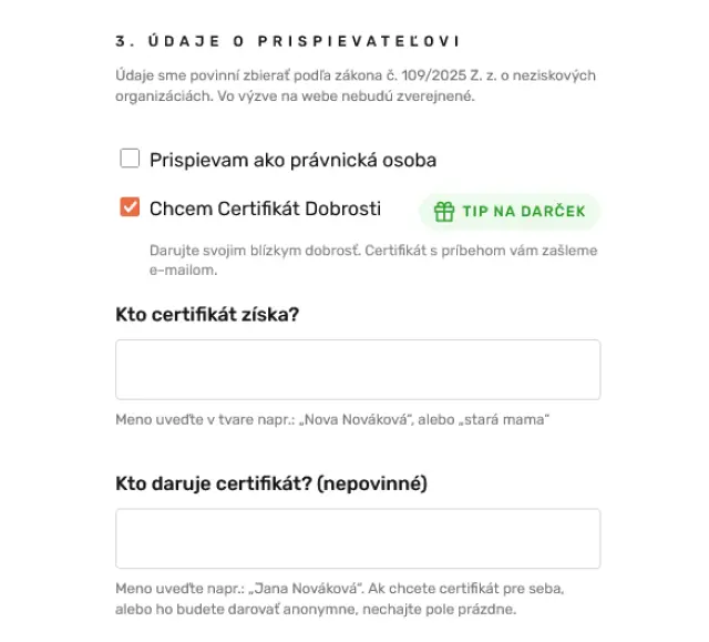 - V časti „Údaje o prispievateľovi“ zaškrtni políčko „Chcem Certifikát dobrosti“