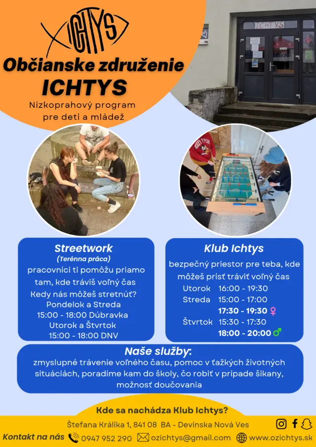 OZ ICHTYS už 18 rokov poskytuje deťom a mladým ľuďom stabilné útočisko a odbornú pomoc. Tento rok potrebujú vašu podporu, aby mohli pokračovať v tejto dôležitej práci. Pomôžte im udržať klub otvorený a zabezpečiť, že mladí ľudia budú mať vždy miesto, kam sa môžu obrátiť.