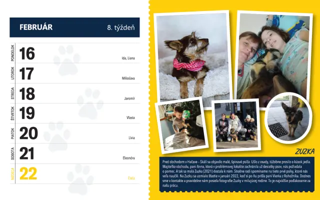 Stolový kalendár sme sa rozhodli vydať pri príležitosti 5. výročia založenia útulku v meste Hnúšťa, ktorý je jediným útulkom v ťažko skúšanom okrese Rimavská Sobota. Obsahuje výber príbehov 48 psíkov, ktoré zanechali stopu v našich srdciach a spomienkach.