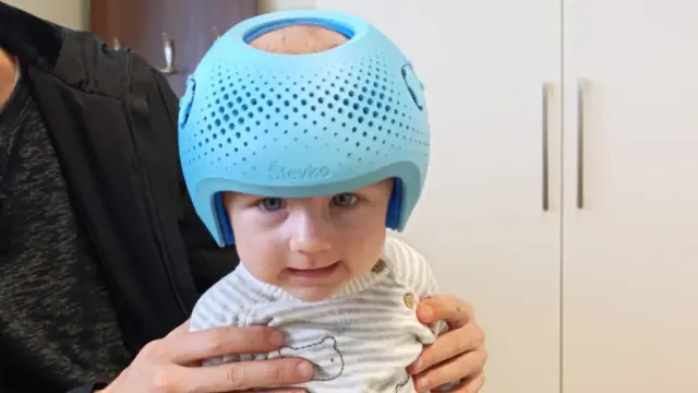 Števko po poslednom vyšetrení dostal na ochranu hlavičky takúto helmičku a bude musieť byť naďalej sledovaný v mnohých ambulanciách.