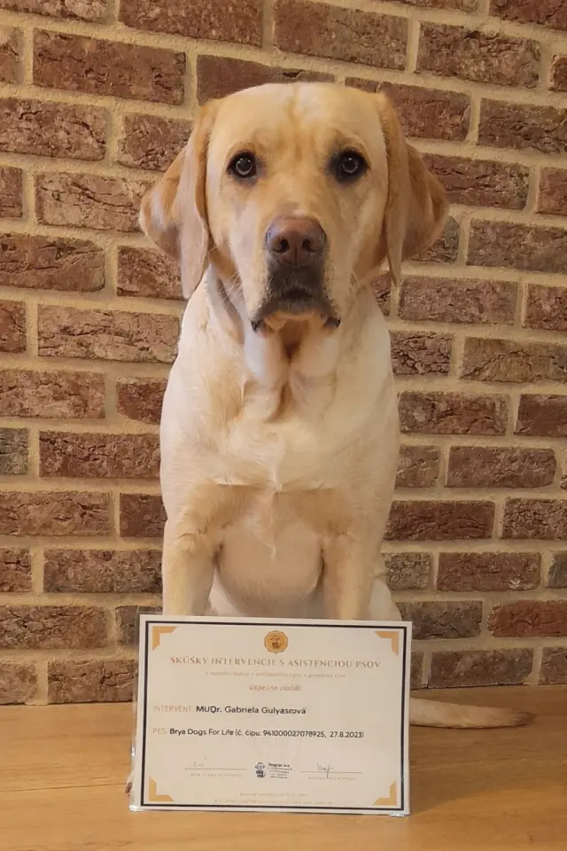 Vďaka vám s Bryou sme úspešne zložili skúšky z intervencie s asistenciou psov. Vďaka tomu, Brya môže začať pracovať na rôznych pracoviskách a pomáhať tým, ktorí to najviac potrebujú.