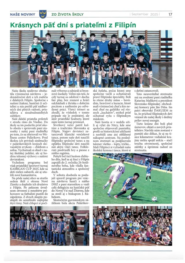 Po úspešnom účinkovaní filipínskych žiakov na kultúrno-športovom podujatí Kaibigan Cup 2025 v Palárikove boli futbalisti Základnej školy K. Strmeňa z Palárikova pozvaní na Futbalový festival na Filipínach, kde sa stretne približne 200 tímov z celej Ázie.
