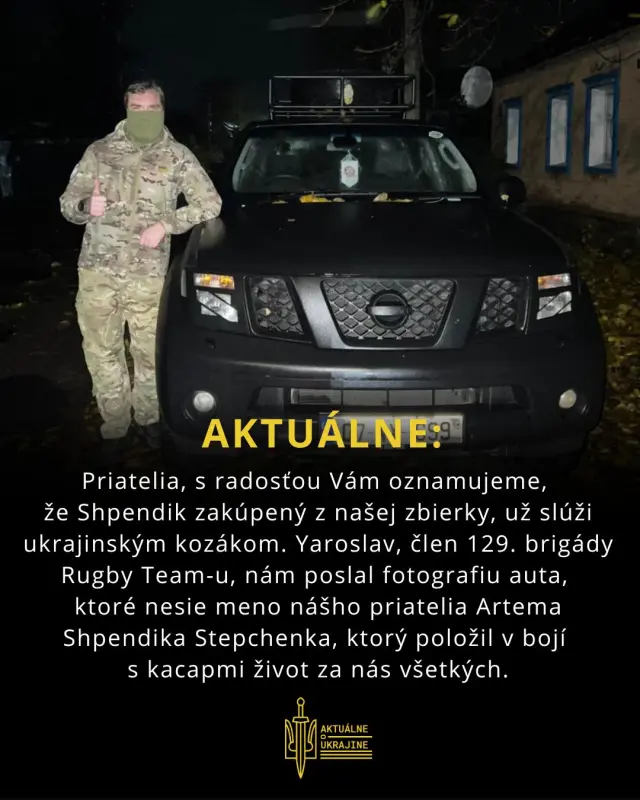 Poďme spoločne podporiť ukrajinských obrancov z 129. brigády Rugby Team. V mene hrdinu Artema „Shpendika“ Stepchenka, ktorý obetoval svoj život, organizujeme zbierku na nákup motorového vozidla. Vaša pomoc je kľúčová pre slobodu a bezpečnosť našich priateľov na Ukrajine.