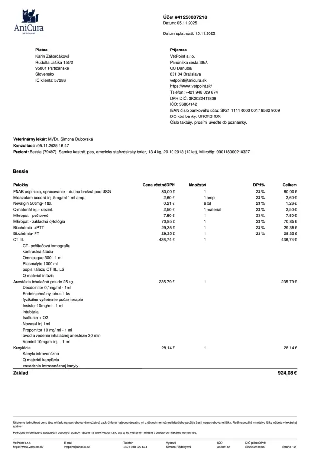 Veľmi na rýchlo sme dostali termín na CT vyšetrenie a biopsiu, ktorú Bessie včera (5. 11. 2025) absolvovala na klinike VetPoint v Bratislave. Na klinike strávila niekoľko hodín, ale všetko dopadlo dobre. Bessie ešte oddychuje po včerajšku, má lieky na bolesť a teraz nám ostáva, už len čakať na výsledky, ktoré by mali byť do pár dni.
