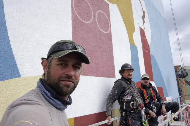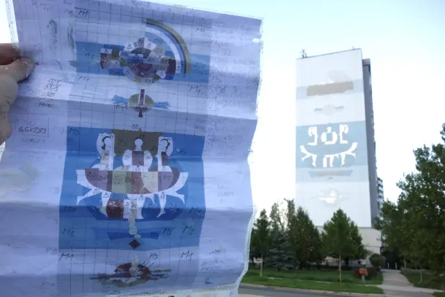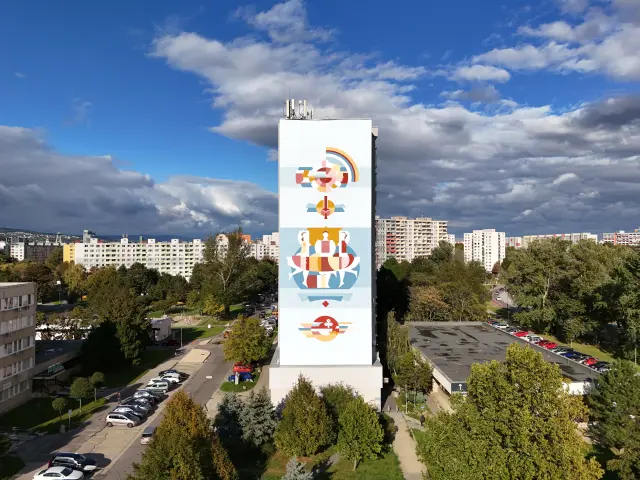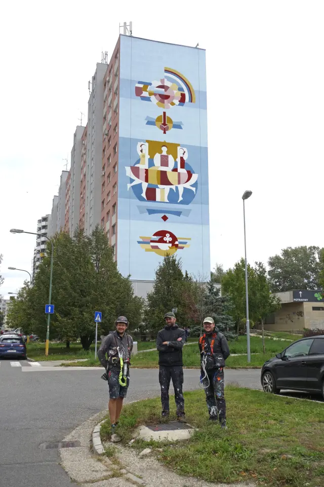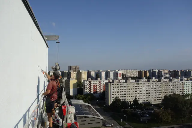 Dnes, po 9-tich dňoch itenzívnej práce môžeme konečne prehlásiť dielo za dokončené. Spolu s úžasnými výtvarníkmi Mišom Turkovičom a Matejom Maturkaničom sa nám podarilo znovuoživiť ďalšiu petržalskú monumentálnu maľbu, ktorá by inak ostala „pochovaná“ pod zateplením.