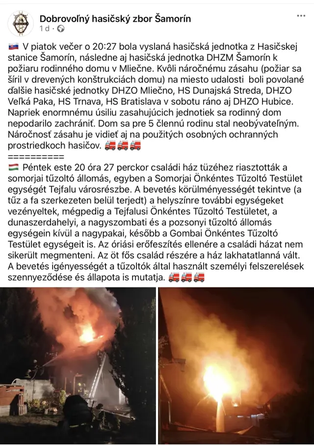 V piatok 7. novembra 2025 o 20:30 vypukol požiar v našom dome v Mliečne. Na miesto prišlo niekoľko hasičských jednotiek zo Šamorína, Dunajskej Stredy, Veľkej Paky, Trnavy, Bratislavy aj Hubíc.