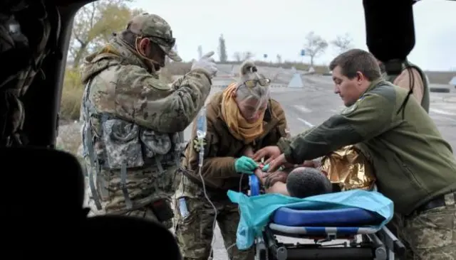 … ťažko zranených obrancov na ceste zo stabilizačného bodu do nemocnice.