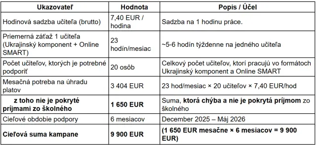 Cieľom tejto kampane je získať finančné prostriedky na úhradu nákladov na vzdelávanie ukrajinských žiakov, ktorí žijú na území Slovenska a študujú v škole SchoolToGo (vo formátoch „Online SMART“ a „Ukrajinský komponent“). Financovanie je potrebné na aktuálny školský rok (6 mesiacov, do mája 2026).