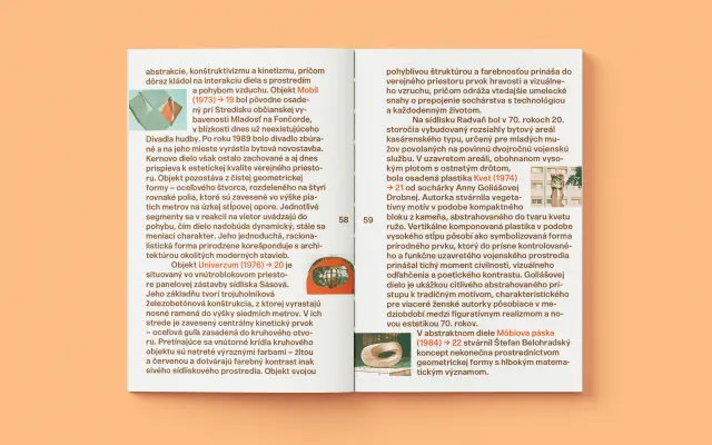 Publikácia je rozdelená na štyri kapitoly, ktoré sa venujú dielam z rozličných období druhej polovice 20. storočia. Predstavuje tvorbu stalinského socialistického realizmu (50. roky), socialistickej neskorej moderny (60. – 80. roky), naprieč rokmi mapuje tvorbu venovanú Slovenskému národnému povstaniu a špecifický priestor dostávajú aj fontány na území mesta a ich funkcia. Fundovaný text zároveň prehľadne interaguje s fotografiami umeleckých diel v ich aktuálnom stave.