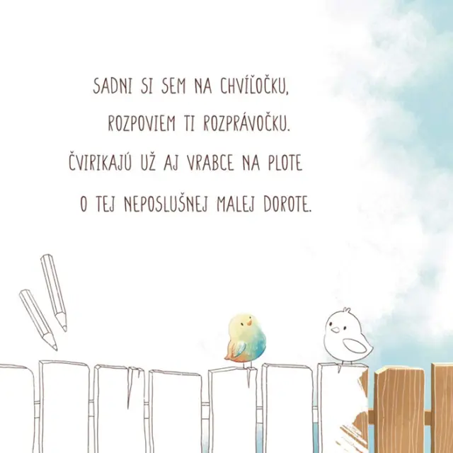 Čítanie o Dorotke, alebo počúvanie jej príbehu bude skvelým zážitkom, ak budú pri tom dvaja. Mamina, ocino, starká, súrodenci, alebo kamoši… na niektorých miestach nájdete symbol pastelky a môžete si ilustrácie spolu domaľovať. A nájdete tu aj všelijaké čiary, na ktorých si môžete trénovať kreslenie prstami.