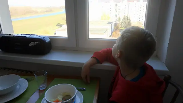 (Na obrázku je výhľad z okna mojich rodičov. Vľavo v pozadí vidno Kočkovský kanál a v popredí sedí môj syn pri kuchynskom stole.)