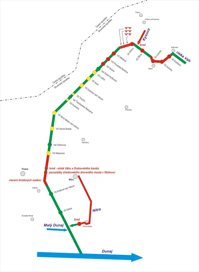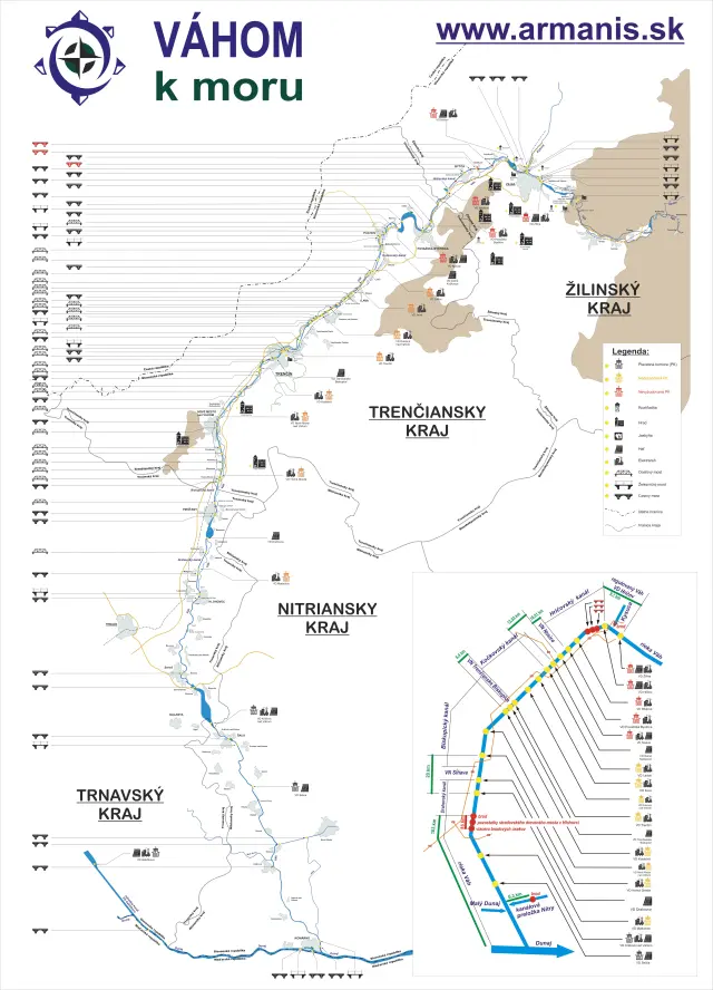(na obrázku je mapa Váhu s dôležitými bodmi pre plavbu – mosty, vodné diela a turistické body v okolí)