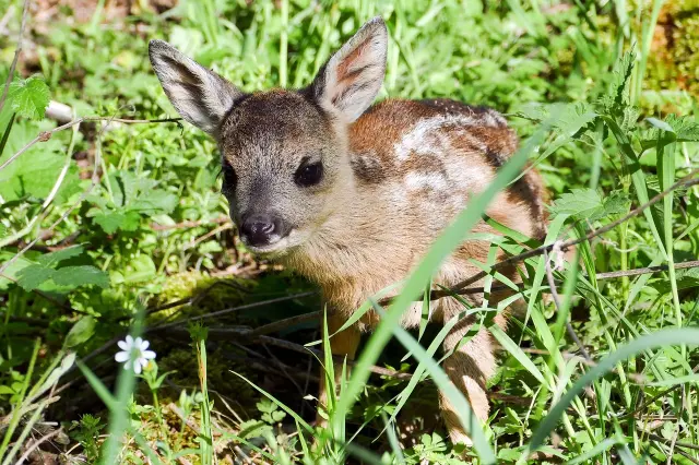 - Srnčiatka, ktoré sa nepohnú a zostávajú skryté v tráve