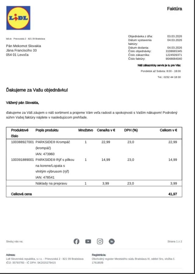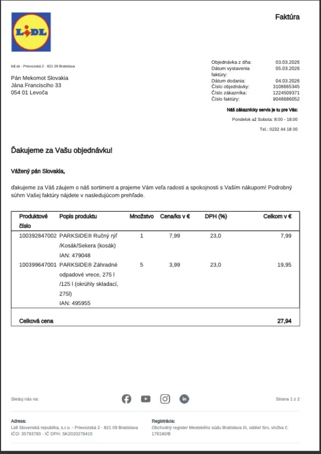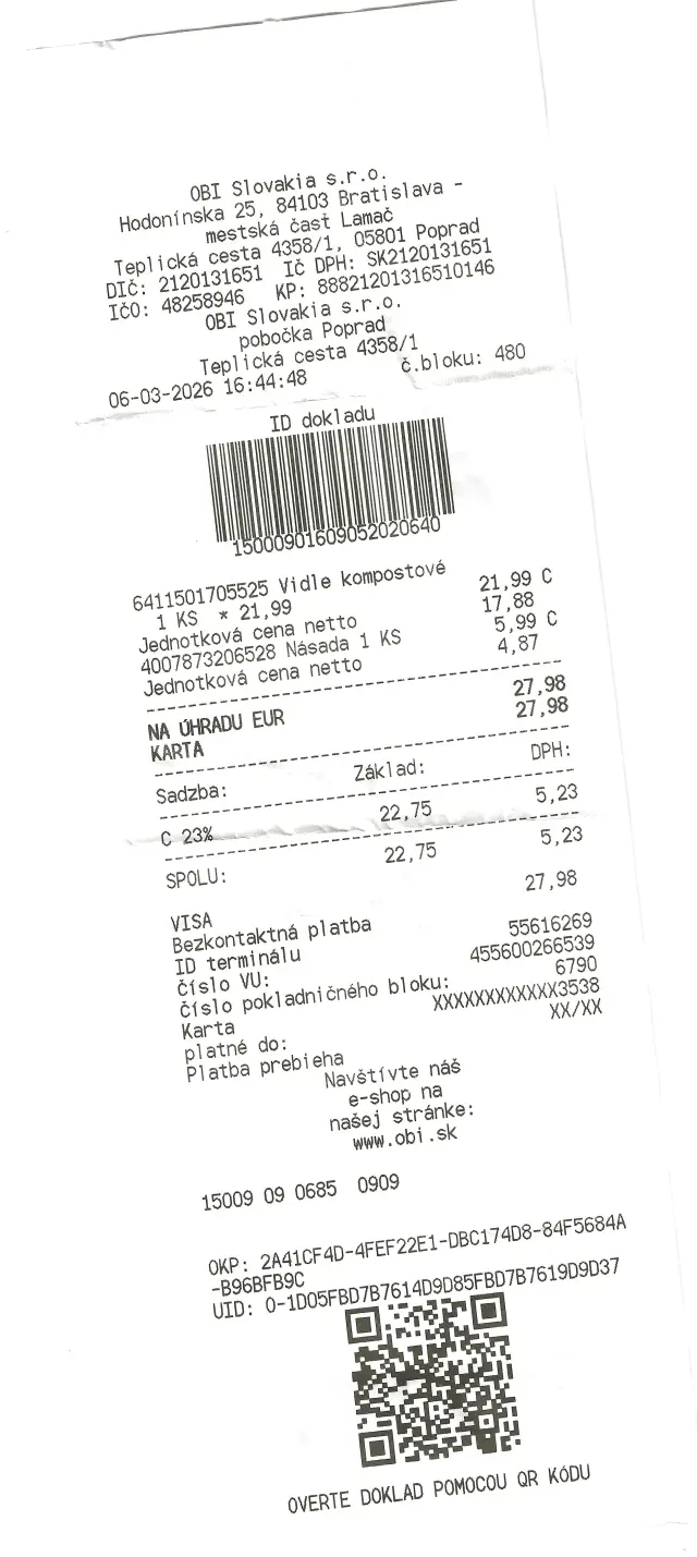 Pripájame ďalšiu účtenku za nákup vidiel a násady na hrable.